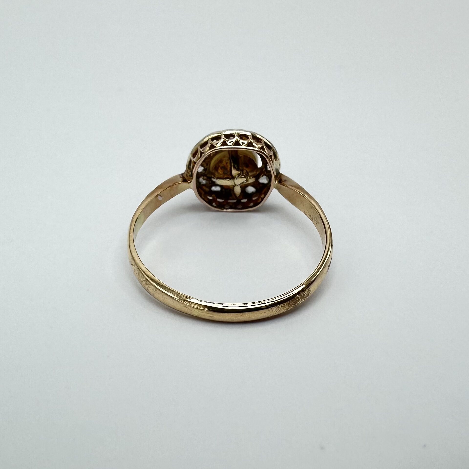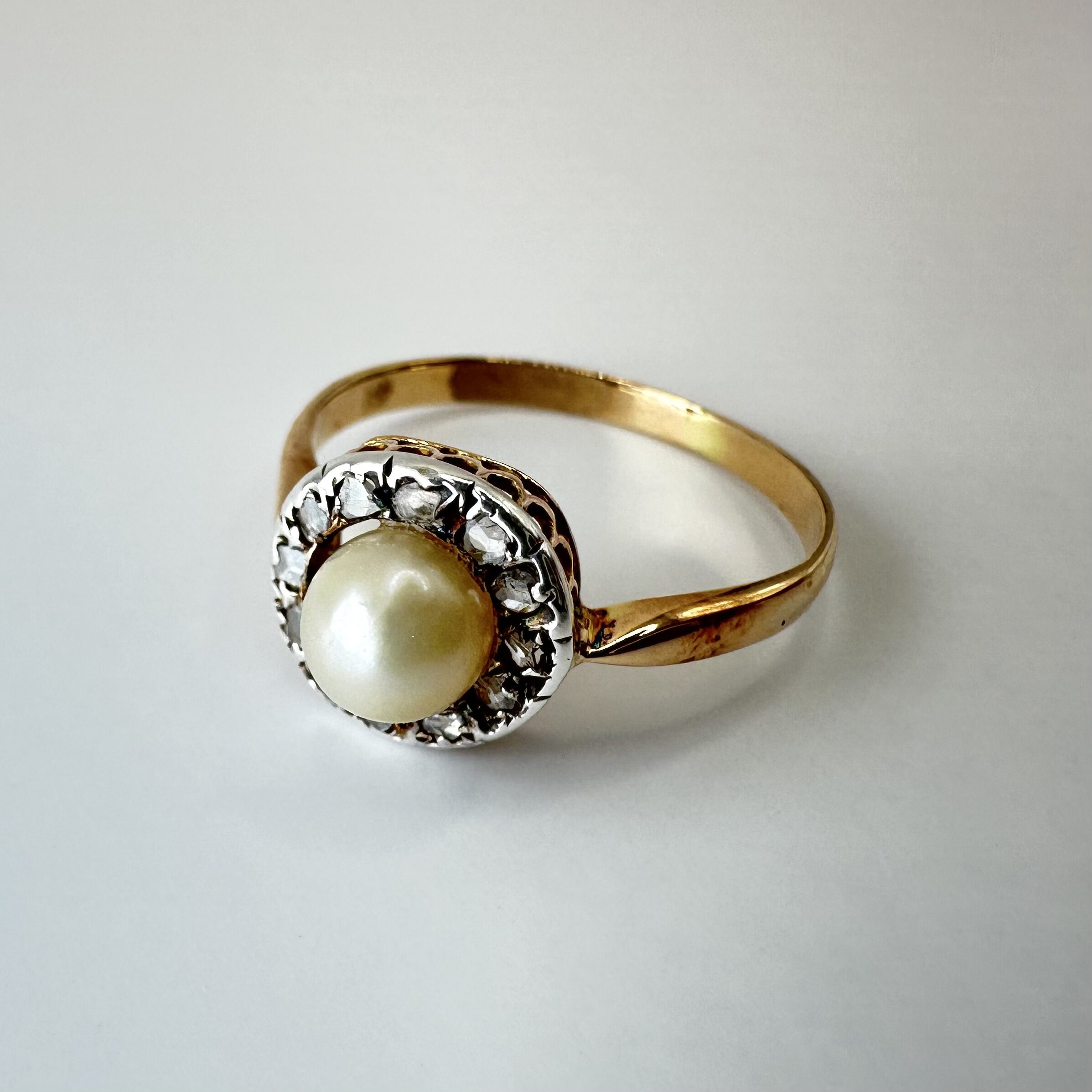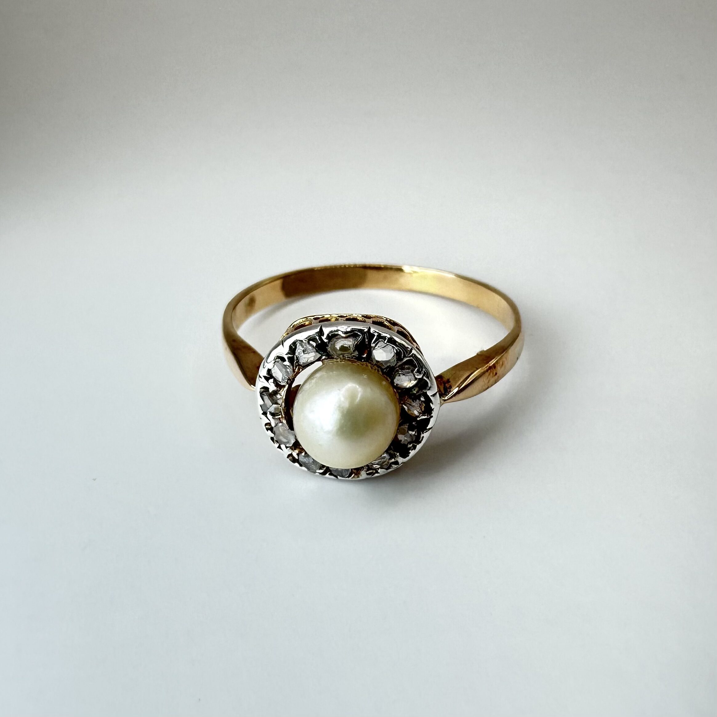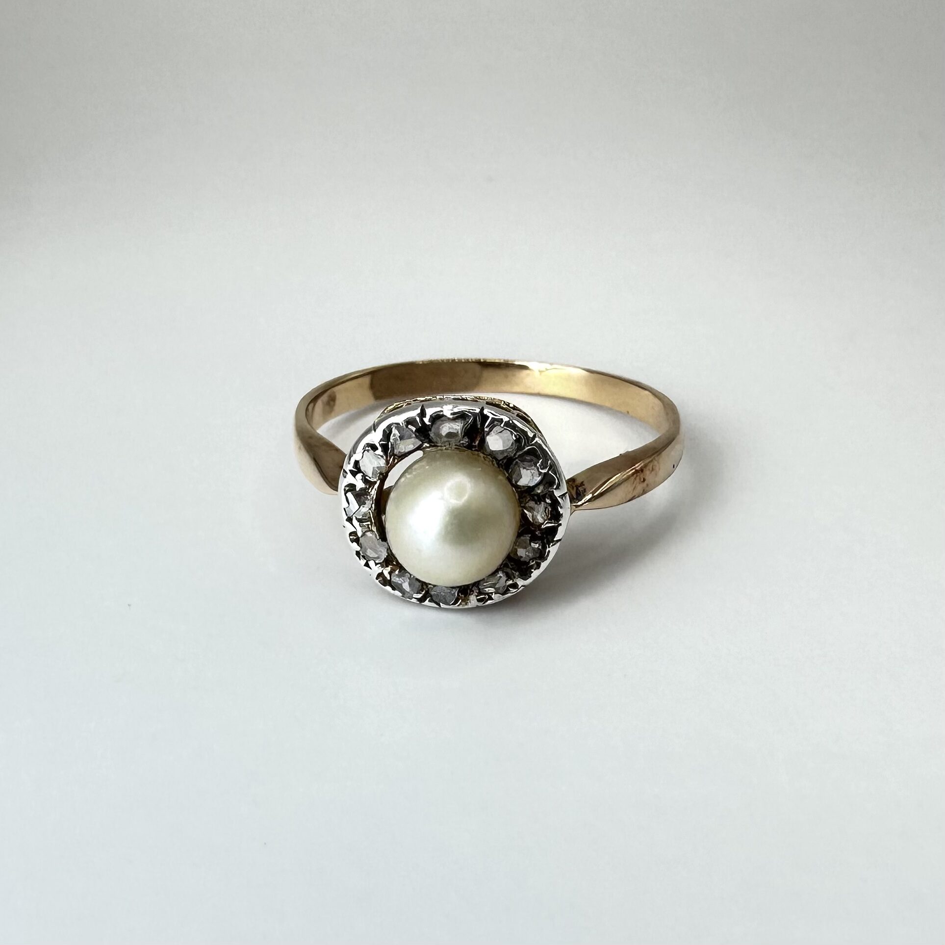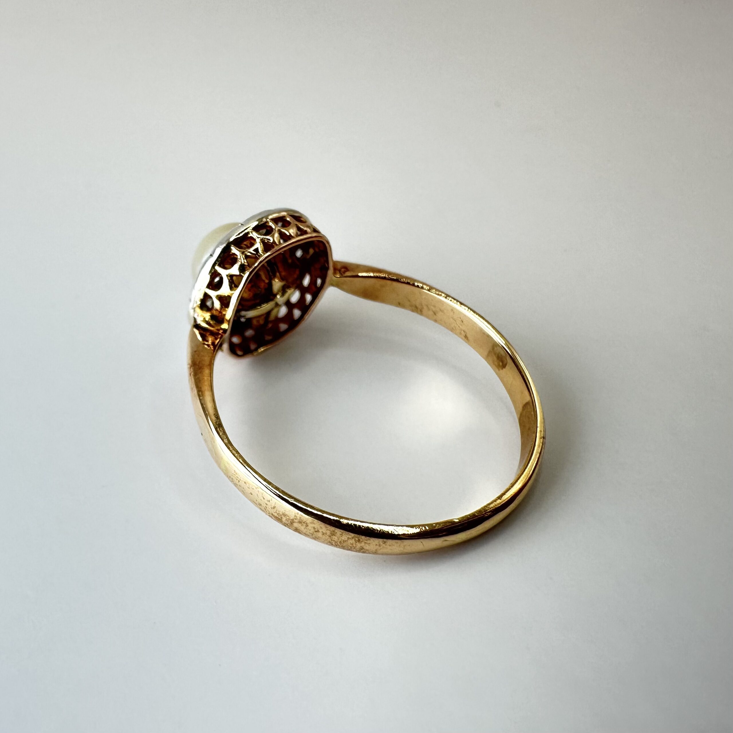 Przepiękny antyczny pierścionek pochodzący z około 1980 roku. Ozdobiony jest aureolą dwunastu diamentów umieszczonych centralną perłę Akoya. Wykonany z 18-karatowego złota.