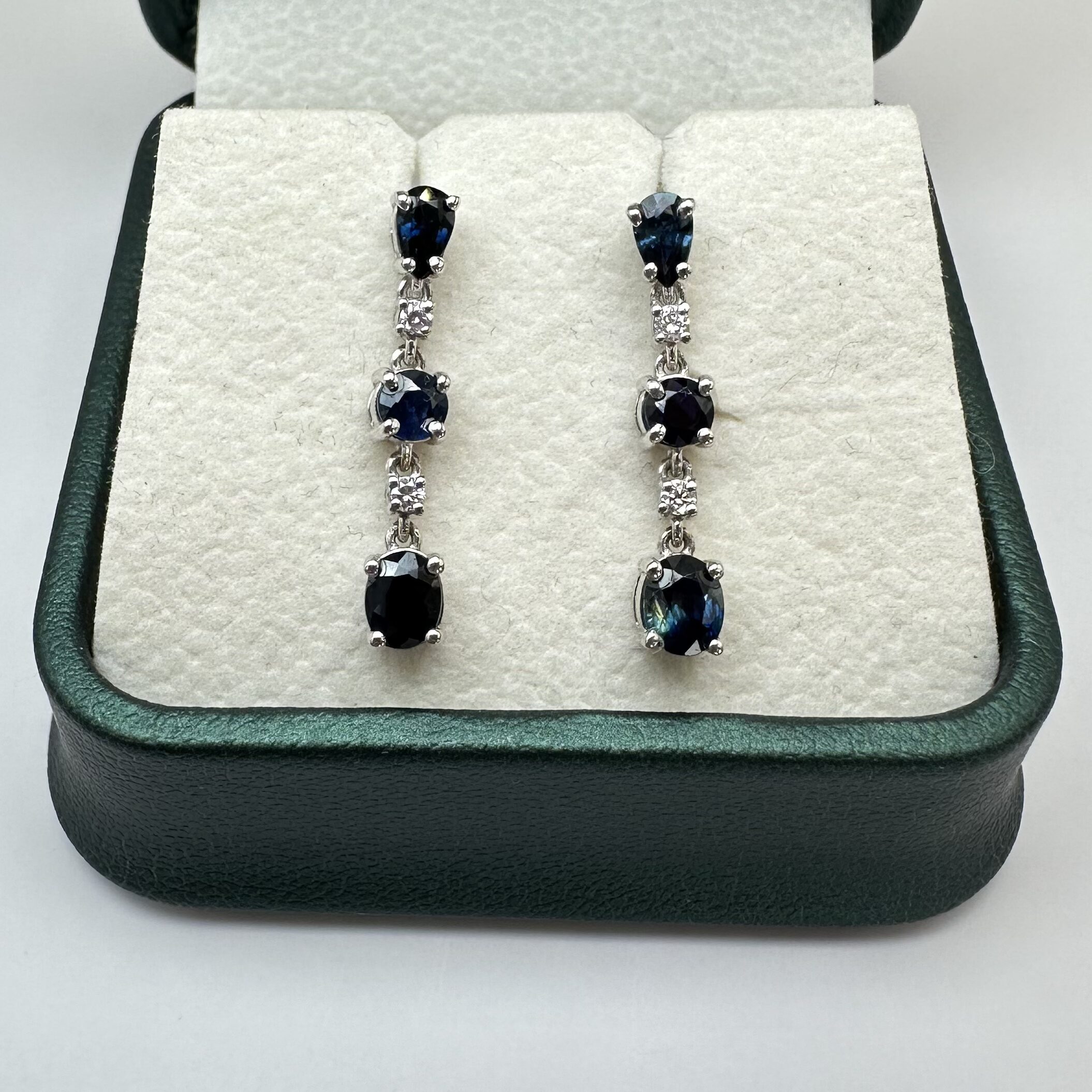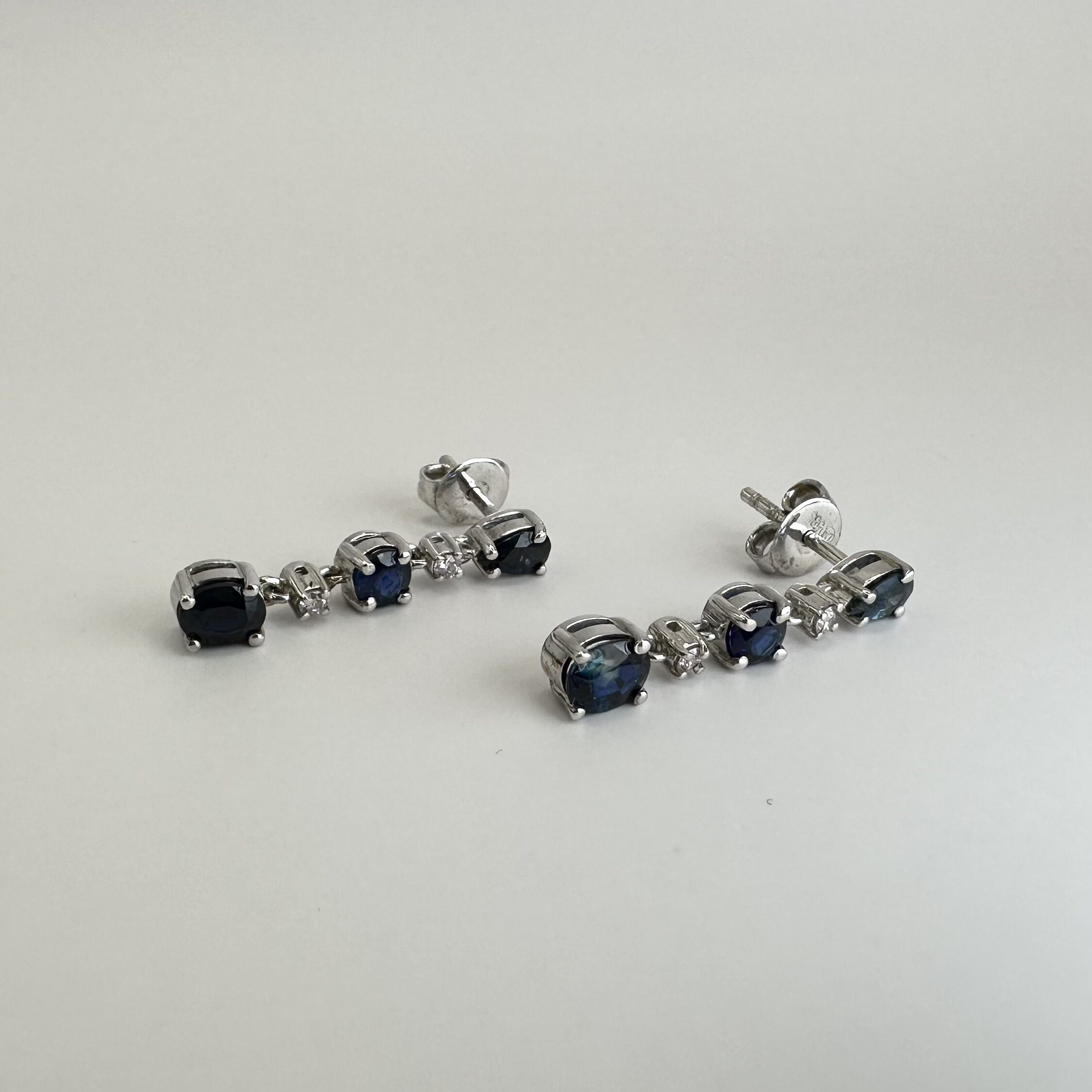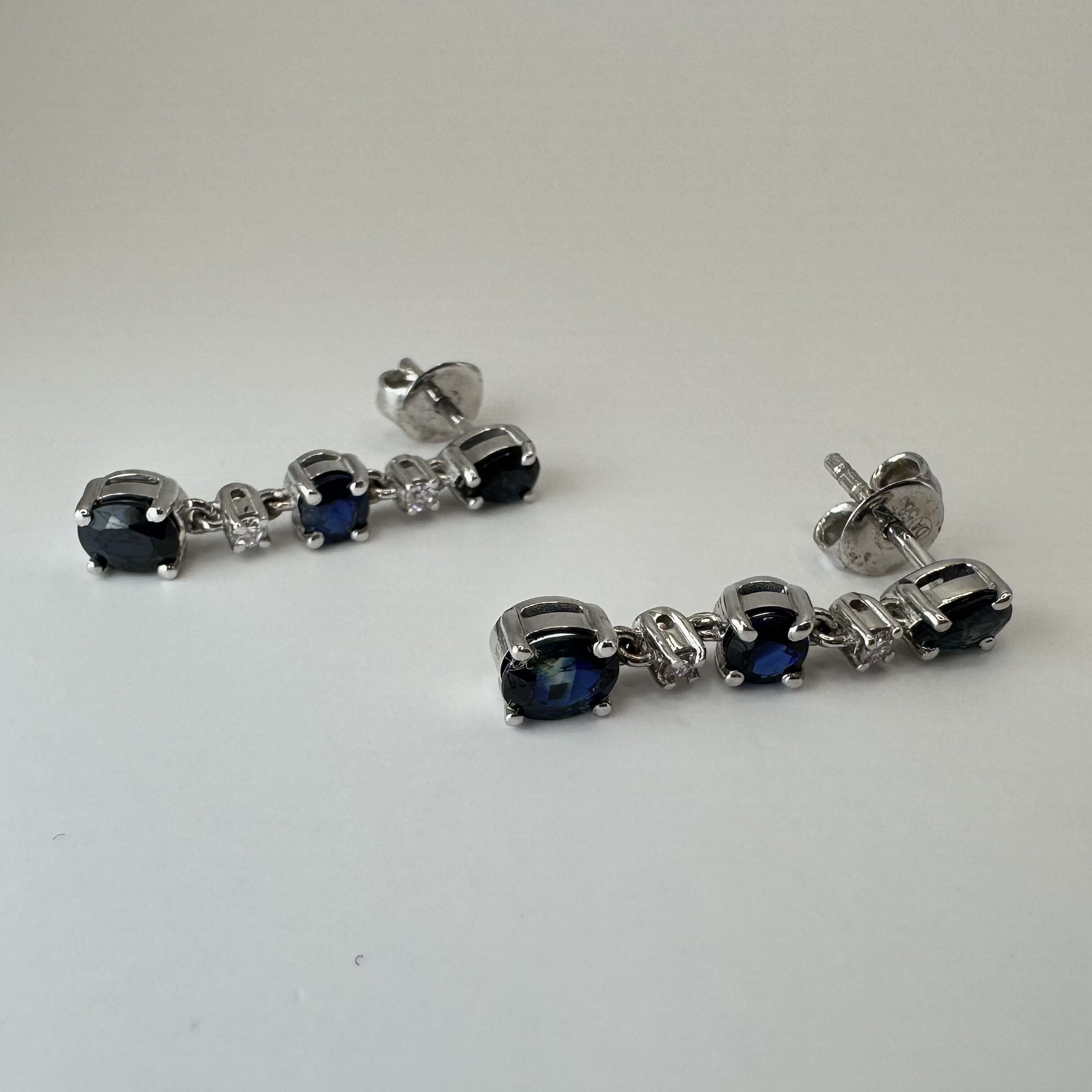 Współczesne delikatne wiszące kolczyki w ponadczasowym stylu. Wykonane z białego złota z przepięknymi niebeskimi szafirami i diamentami. Idealnie sprawdzą się jako uzupełnienie każdej eleganckiej stylizacji, będą efektownym akcentem przy sukniach wieczorowych.
